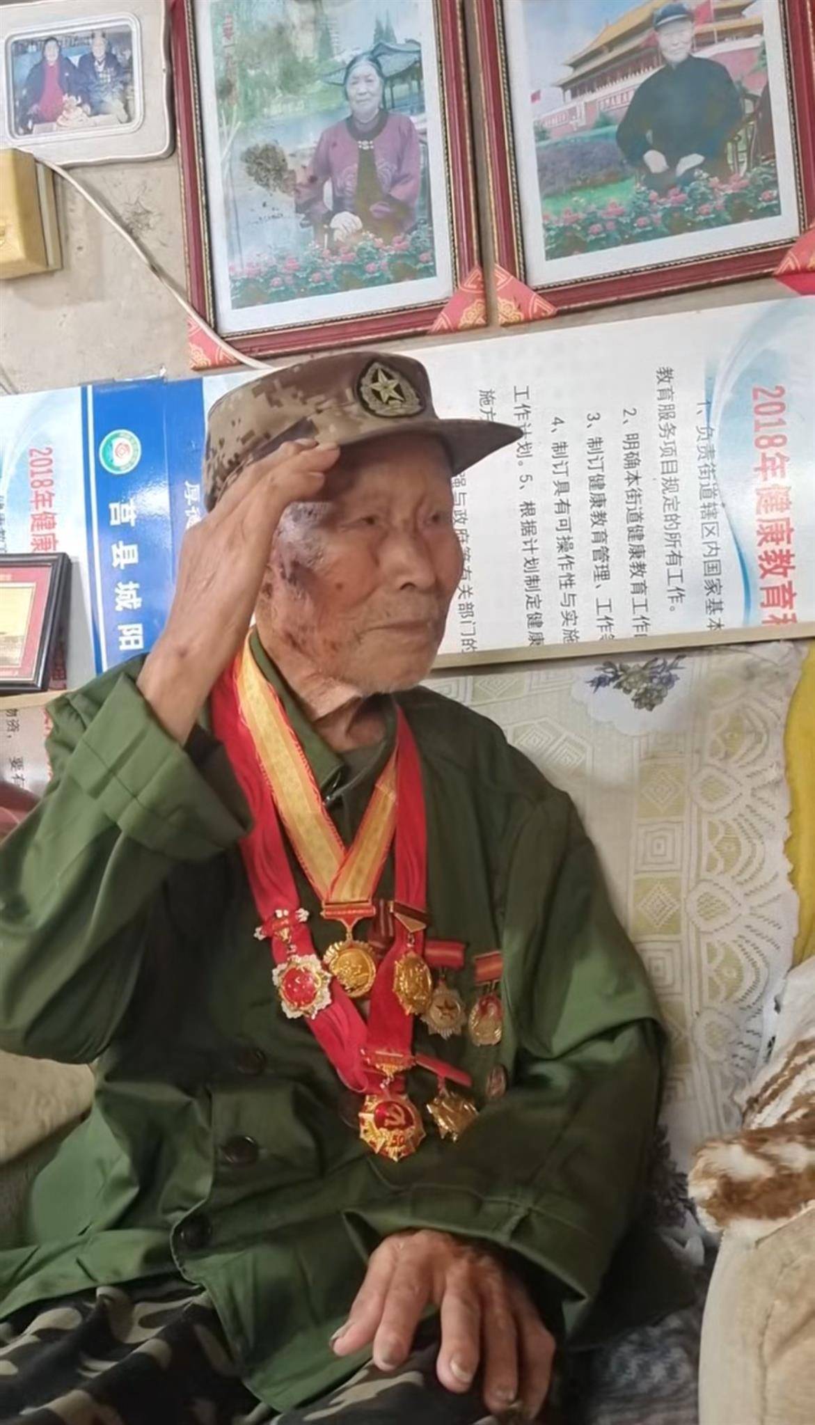 接成法的小女儿接风珍介绍,父亲1926年出生于山东省日照市莒县。她告诉极目新闻记者:“今天早上吃饭时,他非常高兴,说不饿,要换军装。”换好军装后,老人佩戴好中国人民抗日战争胜利80周年纪念章等,在电视机前守候。观看阅兵式时,接成法老人目不转睛地盯着电视机,还举起右手敬礼,这一幕被接风珍用手机记录下来。